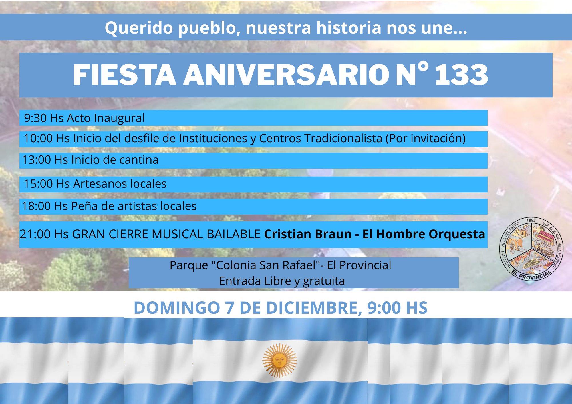 Con motivo del 133° Aniversario de la localidad, las distintas instituciones de El Provincial organizarán una celebración para el
