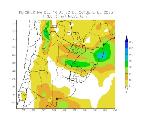 La perspectiva comenzará con temperaturas sobre lo normal, pero muy rápidamente comenzará el paso de un frente de tormenta, con una actividad muy diferencial, produciendo precipitaciones escasas en la mayor parte del área agrícola, a excepción de algunos focos aislados con registros moderados a abundantes sobre el NOA, el sudeste del Paraguay, la Mesopotamia y el norte del Uruguay, y el sudoeste de la Región Pampeana.