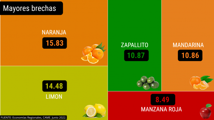 Entre los 5 productos que presentaron mayor diferencia entre los precios de origen y destino, se encuentran los cítricos: naranja (15,83 veces), limón (14,48) y mandarina (10,86). Durante el mes de junio, también tuvieron altas brechas el zapallito (10,87) y la manzana roja (8,49).