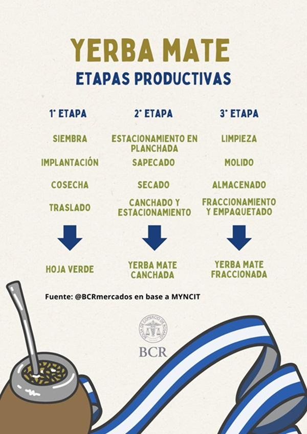 En este sentido, su cadena productiva consta de 3 etapas, comenzando por la etapa de producción primaria, donde se cosecha la hoja verde de yerba mate; luego una primera industrialización en la cual se obtiene la yerba mate canchada tras un proceso de secado y trituración gruesa, que luego de ser estacionado entre 6 y 24 meses pasa a la última etapa de molienda fina y fraccionamiento.