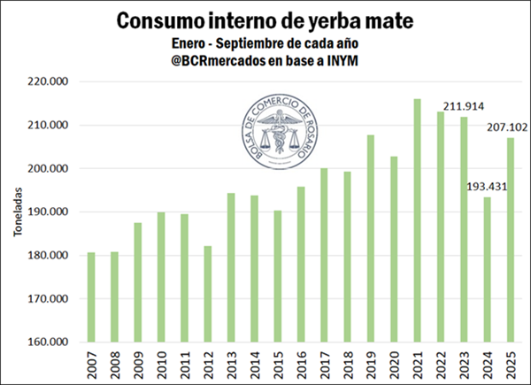 Con un promedio de consumo anual cercano a los seis kilos de yerba por persona por año, el consumo interno muestra una recuperación en este 2025. En este sentido, el período enero-septiembre del año muestra un crecimiento interanual del 7% respecto al mismo período del 2024. De esta manera, el consumo interno revierte parcialmente la caída de 2024 y vuelve a ubicarse en línea con los promedios históricos.