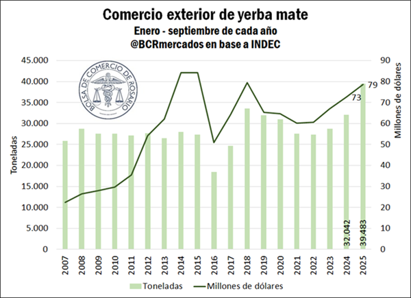 Sin embargo, por las mermas en precios internacionales este máximo en volumen aún no es un máximo en valor, en tanto en 2025 la yerba mate acumula exportaciones por US$ 78,6 millones, aún debajo del máximo en valor nominal del 2015. De esta manera, a pesar de que las exportaciones crecieron 23,3% en volumen, en valor lo hicieron apenas un 8,3% interanual.