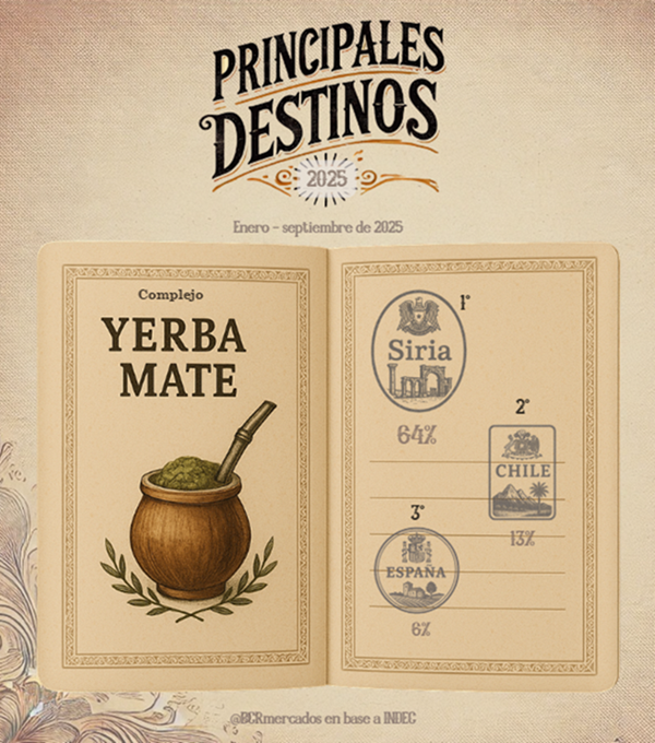 Los datos de exportación correspondientes a los primeros nueve meses del 2025 muestran a Siria nuevamente consolidado como el principal destino de la yerba argentina, con 64% del total exportado, de acuerdo con datos del INDEC. Detrás del país árabe sigue Chile, concentrando el 13% del total. Finalmente, España completa el podio con el 6% de las exportaciones. Resulta importante destacar que la yerba mate se exportó en 2024 a 50 países de lo más diversos, como China, Colombia, Corea del Sur, Costa Rica, India, Dinamarca, Estados Unidos, Israel, Australia, Indonesia, México, Noruega, Nueva Zelanda, Turquía, entre otros.