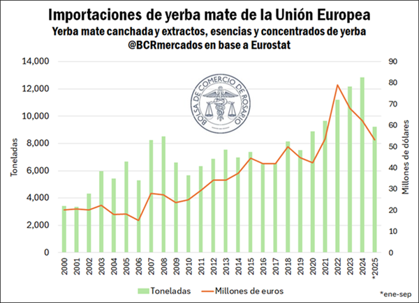 Argentina se destaca a nivel mundial como principal exportador global de la yerba mate, teniendo a Siria como principal destino y además primer importador mundial. Además de ello, la yerba mate se muestra como una industria en expansión con fuerte proyección dentro del segmento de bebidas funcionales. Este segmento tiene especial preponderancia en mercados de alto poder adquisitivo, como la Unión Europea. Desde principios del 2000 hasta la actualidad, las importaciones de yerba mate de la Unión Europea se multiplicaron por 4.