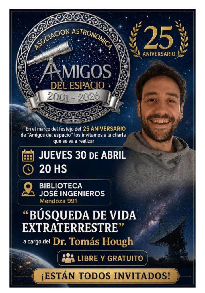 En el marco de su 25° aniversario, el cual se cumplió este ultimo20 de abril de la creación la Asociación Astronómica Amigos del Espacio, y como parte de celebrar la fecha, se organiza una charla abierta a la comunidad titulada “Búsqueda de vida extraterrestre”.