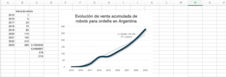En Argentina también se observa similar tendencia de crecimiento con una duplicación de los equipos cada 2-3 años (ver gráfico «Evolución de venta acumulada de robots»). En 2015 se instaló el primer robot en el tambo del INTA Rafaela, el VMS de DeLaval (lo de VMS va por Voluntary Milking System, es decir, sistema de ordeñe voluntario, en castellano, sigla que quedó incorporada al nombre del equipamiento).