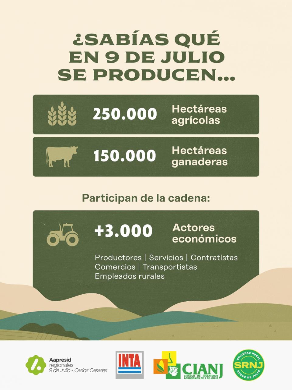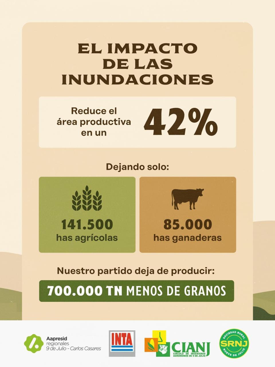 El informe elaborado por las cuatro entidades, describe que 9 de Julio en materia agro productiva; de las 250.000 has. agrícolas y 150.000 has. ganaderas, donde unos 3.000 actores de toda la cadena, como productores, servicios, contratistas, transportistas y empleados rurales trabajan, la superficie productiva se redujo un 42%, esto es 141.500 has. agrícolas y 85.000 has., en ganadería; lo que redunda en 700.000 toneladas de granos que se dejaron de producir en el distrito.