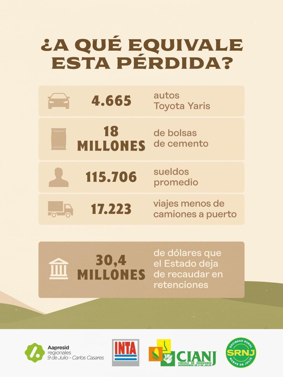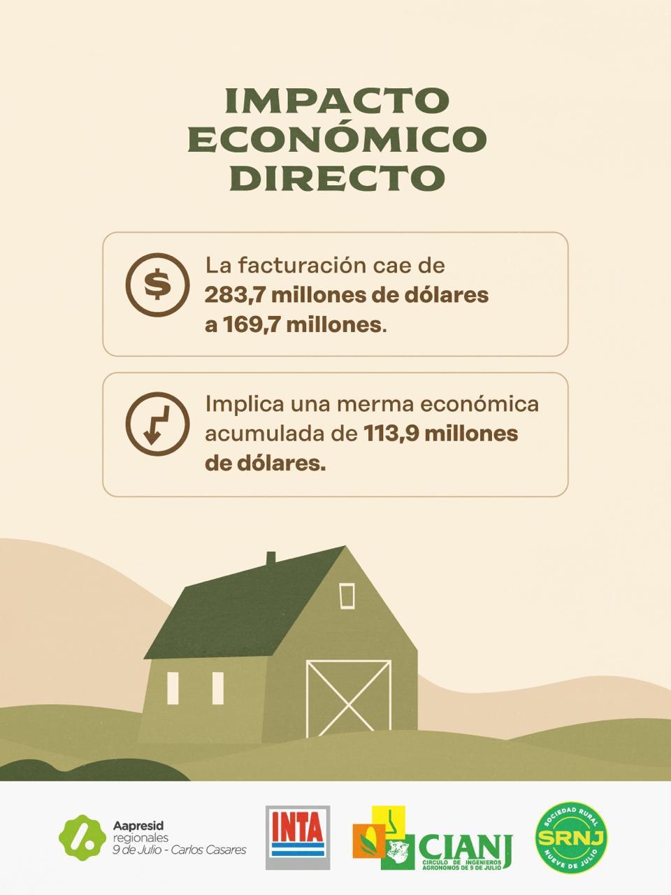 Sociedad Rural de 9 de Julio, junto con la Agencia de Extensión Rural INTA 9 de Julio, el Circulo de Ingenieros Agrónomos de 9 de Julio, y la Regional Aapresid 9 de Julio-Casares elaboraron un informe con el objetivo de tomar dimensión de la perdida productiva y económica. En numero equivale a la perdida de 115.000 salarios promedios del distrito