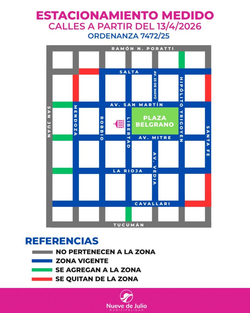 La Municipalidad de Nueve de Julio informa a los usuarios del Sistema de Estacionamiento Medido 8SEM) que, a partir del lunes 13 del corriente mes, se implementará una modificación, en el marco de los cambios aprobados por la Ordenanza N° 7472/25.