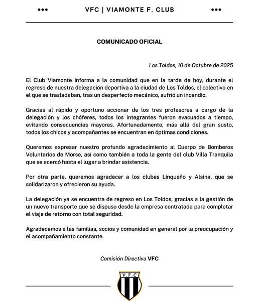 Conforme se conoció el ultimo viernes 10, jornada no laborable por el feriado nacional, una delegación de jugadores de inferiores del Club Viamonte FC, que se movilizaba en un ómnibus de pasajeros, tras competir en su condición de visitante ante O’Brien del partido de Bragado, a su regreso por Ruta 46 a pocos kms. de O’Brien, se incendio completamente.