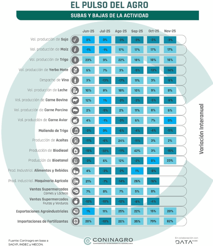 En ese contexto, el primer informe 2026 de Coninagro de Economías Regionales, relevó 19 variables y encontró que 9 mostraron variaciones interanuales negativas, el mayor nivel de incidencia de todo 2025. La comparación se hace contra noviembre de 2024, un mes en el que ya había señales de recuperación, lo que endurece el contraste estadístico.