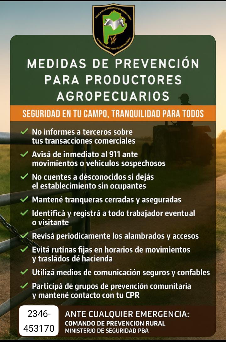 En las ultimas horas desde el Comando de Prevención Rural (CPR) 9 de Julio difundieron recomendaciones del Ministerio de Seguridad de la Provincia de Buenos Aires, una serie de medidas preventivas destinadas a productores agropecuarios, con el objetivo de reforzar la seguridad en el medio rural y brindar mayor tranquilidad a las familias de la ruralidad y productores.
