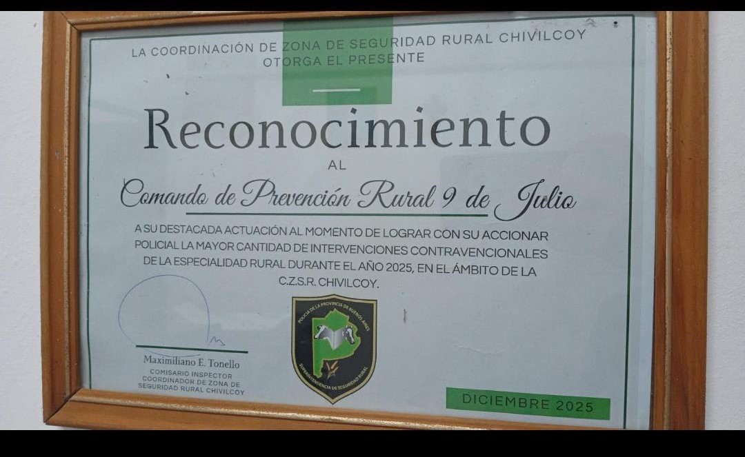 En la oportunidad se reconoció la labor efectuada durante el año 2025, donde se entrego distinción al «Mérito y Estímulo» a personal policial que cumple funciones en la división Patrullas Rurales de la región, entre ello, el CPR 9 de Julio, a cargo del Comisario Inspector Mario Cattureti, y el elemento policial de 9 de Julio, fue reconocido por su labor como así también efectivos del elemento policial.