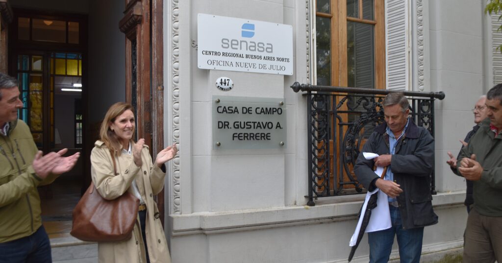 Sociedad Rural de 9 de Julio llevo adelante este lunes 20junto a autoridades de la Fundación Nuevejuliense para la Sanidad Animal – Funuesa- un sencillo pero emotivo acto, imponiendo el nombre “Dr. Gustavo Ferrere” al edificio de Casa de Campo, ubicado en Av. Vedia 487.