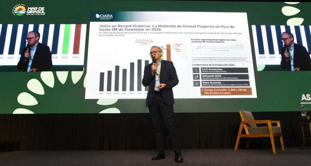 Idigoras insistió en las metas del sector. “La ambición es duplicar las exportaciones del complejo de girasol. Es realizable, podemos alcanzar esa producción y tener más de 4 millones de hectáreas bajo producción. Pasar de 1,5 millón de toneladas de exportación de aceite a 3 millones”. También destacó el impacto económico. “Esta industria le va a dar este año a la Argentina US$ 2.800 millones. Le puede dar en los próximos tres años, por año, US$ 5.000 millones. Seríamos la cuarta industria de divisas de la Argentina”.