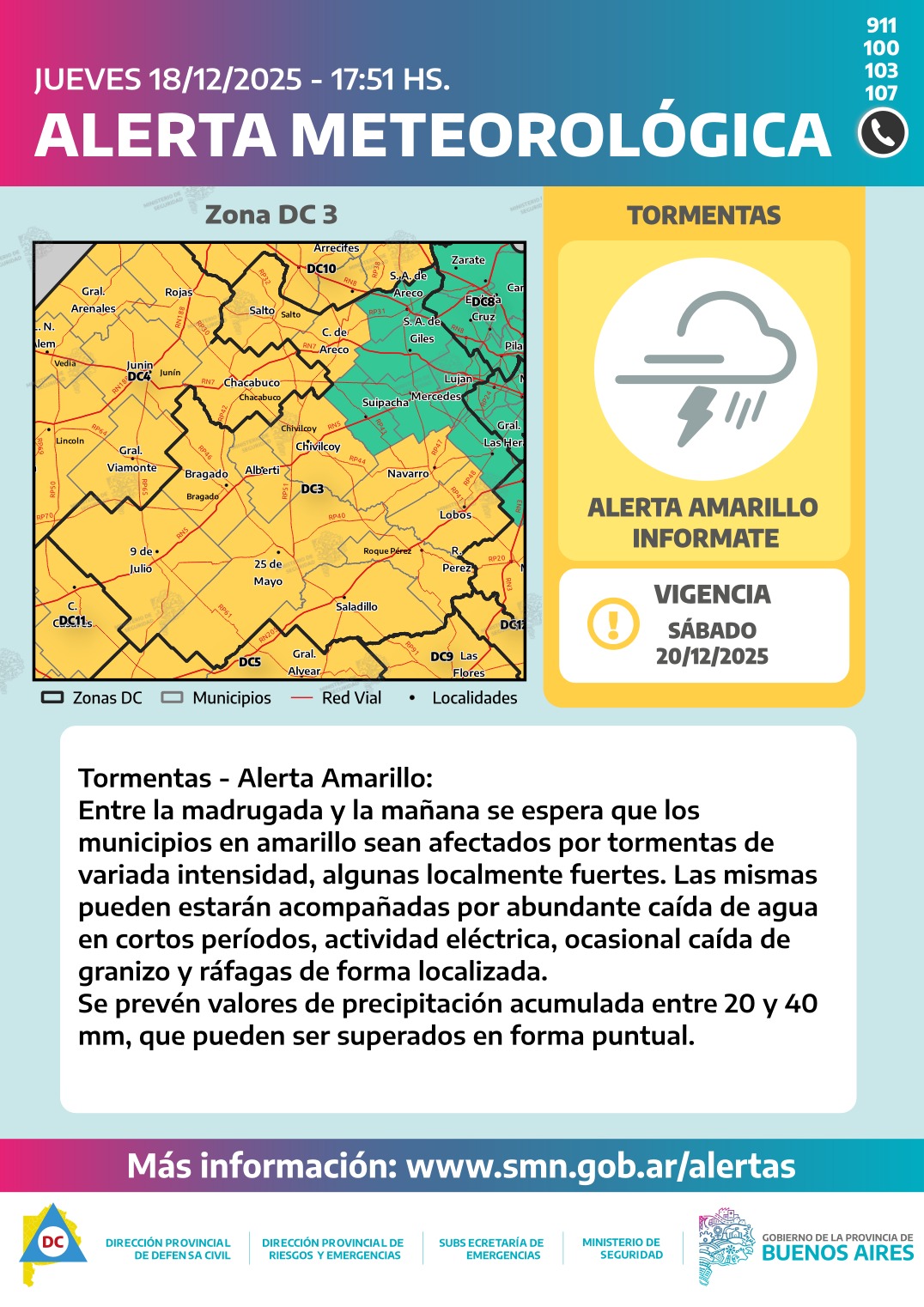 Desde la Oficina de Defensa Civil 9 de Julio, se dio a conocer a partir de un informe del Servicio Meteorológico Nacional -SMN-que entre la madrugada y la mañana del sábado 20 se espera que el oeste y noroeste de la provincia continúen siendo afectados por el avance de un frente frío, generando lluvias y tormentas de variada intensidad. Algunas pueden ser localmente fuertes principalmente durante la madrugada», describe el informe.