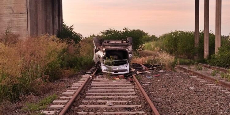 Un automóvil que circulaba por el lugar, con seis personas en su interior, choco la defensa de la ruta y cayó sobre las vías, quedando volcado.