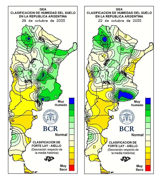 También esta semana los técnicos destacan que está creciendo algo más lento por las bajas térmicas y se observan casos puntuales de fitotoxicidad. Sin embargo, los técnicos confían en que las plantas se recuperarán con el ascenso térmico. El buen desarrollo foliar previo al descenso térmico y la humedad acumulada fueron claves para sostener la condición de los cultivos. En el norte bonaerense, advierten posibles pérdidas de nitrógeno por las abundantes lluvias del pasado fin de semana —acumulados de hasta 160 mm en Pergamino— ya que “no se prevén refertilizaciones debido a los altos costos”.