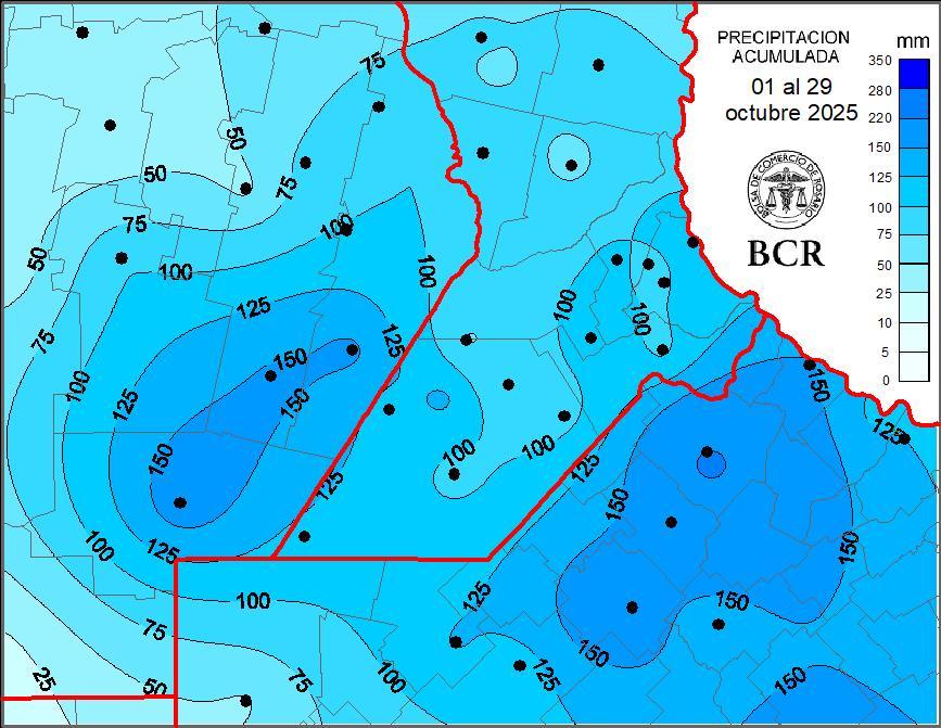 La media mensual del mes suele estar en la región núcleo entre 75 a 100 mm, y termina con 105 mm como media de las 36 estaciones de la red GEA/BCR. Con una particularidad, el 60% de las lluvias mensuales se acumularon en las lluvias del último fin de semana, sumando la actividad del viernes pasado. El agua era requerida para afianzar el llenado del trigo, sobre todo en la franja este, dónde se esperaban entre 50 y 60 mm para transitar sin déficits la última etapa que definirá el peso del grano. La tormenta cumplió con creces, los acumulados estuvieron entre 30 y 160 mm. El máximo valor se registró en Pergamino.