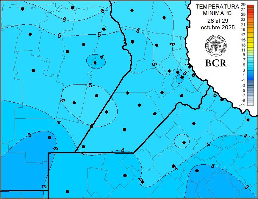 Las temperaturas mínimas fueron muy bajas los días martes 28 y miércoles 29 de octubre, especialmente el día 29. Estuvieron entre 2 y 6°C y el menor valor se midió en la localidad de Chacabuco, en Buenos Aires, con 2,5°C. Hay que aclarar que estos valores se miden en un abrigo meteorológico y a más de un metro de altura, por lo que valores medidos de 2 a 3°C se corresponderían con valores iguales o inferiores a cero grados al nivel del suelo a la intemperie.