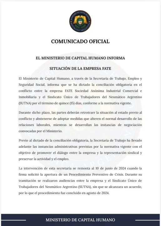 “Se tramitaron acuerdos de suspensión en el marco del artículo 223 bis de la Ley de Contrato de Trabajo, uno de los cuales fue homologado y otro se encuentra pendiente de ratificación, debido a la negatividad sindical. El Ministerio de Capital Humano continuará promoviendo las instancias de mediación necesarias, en resguardo del empleo y del cumplimiento de la normativa laboral y de seguridad social vigente”, concluyó.
