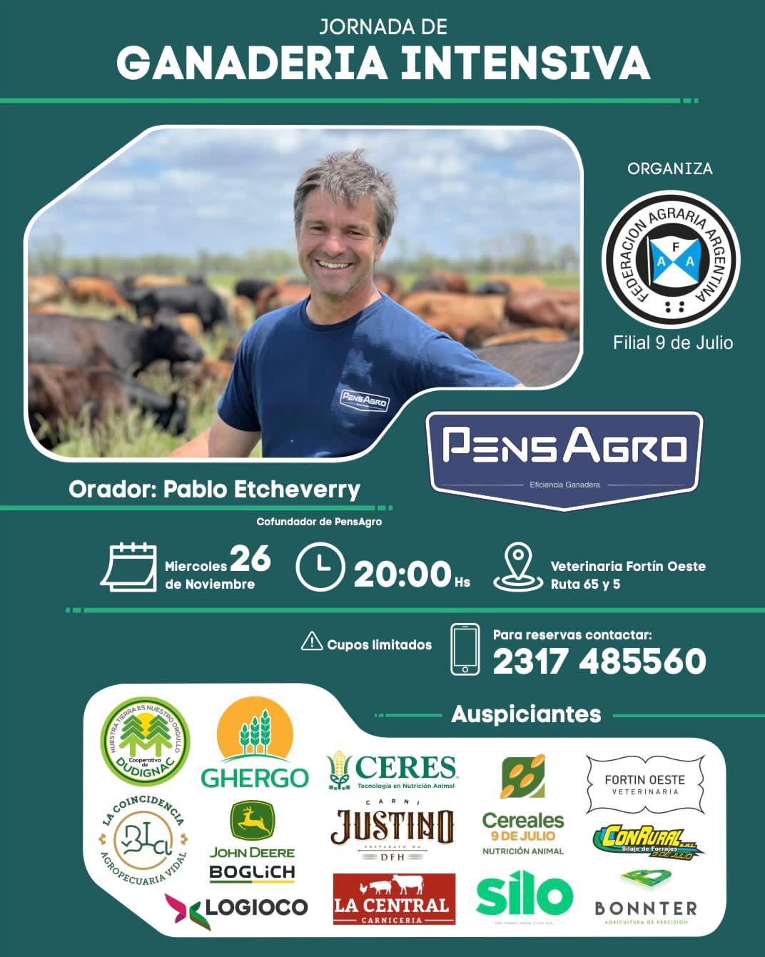 La filial Federación Agraria Argentina de 9 de Julio informo que este miércoles 26 habrá de desarrollar una Jornada de Ganadería Intensiva en 9 de Julio, con la disertación de Pablo Etcheverry, cofundador de PensAgro.