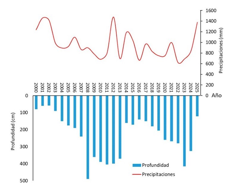 Considerando un cultivo con raíces que exploran 150 cm se puede observar que en los años 2001 al 2004 tuvo lugar “al acoplamiento” con la napa. Si las raíces fuesen de pastura perenne, con raíces de 300 cm, en el período comprendido entre el 2008 al 2013 se registró acoplamiento. En periodos entre el 2008 al 2013 la napa profundizo llegando a desacoplarse en parte de los cultivos que se realizan en la zona. Por otra parte, en periodos lluviosos la napa alcanzó estratos cercanos a la superficie como en el año 2001,2002,2003 y 2025, limitando establecimiento de cultivos y algunas prácticas culturales por falta de transitavilidad.