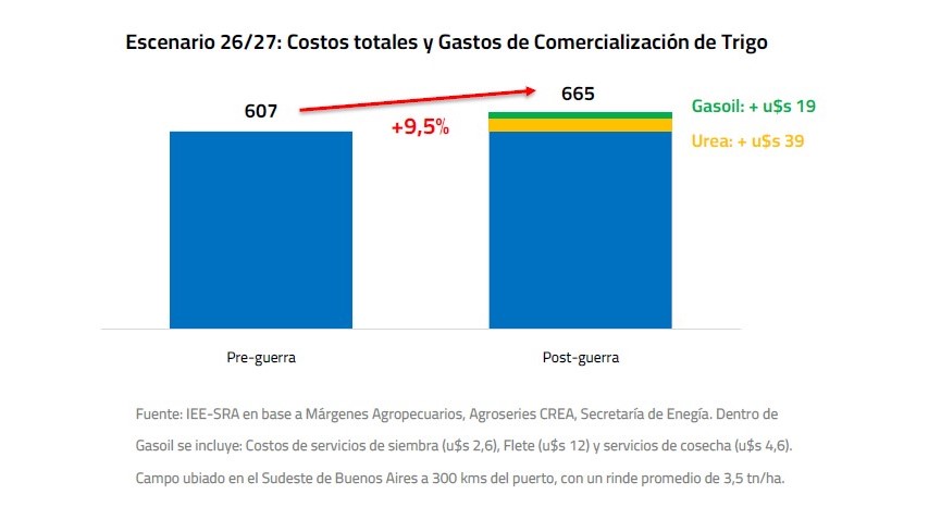 Estimamos que, con los aumentos expresados hasta el momento, el costo de producción para la cosecha fina 2026/27 (trigo) podría aumentar por esta causa entre un 9,5% y un 11% según la distancia a puerto que deba afrontar.