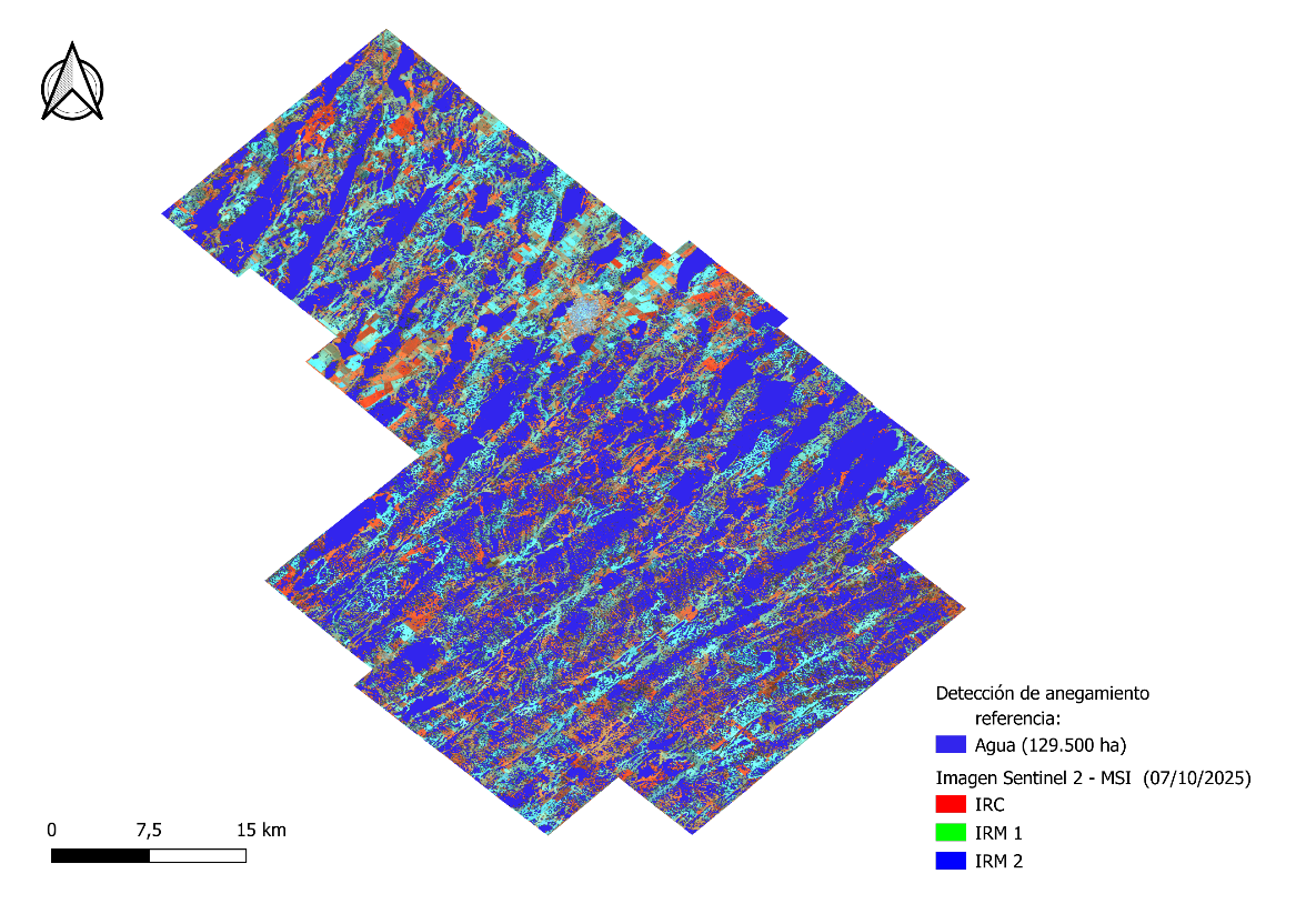 Para el presente informe se realizó el procesamiento y análisis de imágenes Sentinel 2 MSI. Las estimaciones de áreas anegadas se obtuvieron a partir del agrupamiento de pixeles similares según su valor de índice de agua de diferencia normalizada modificado (mNDWI). Los datos fueron depurados para eliminar falsos positivos.