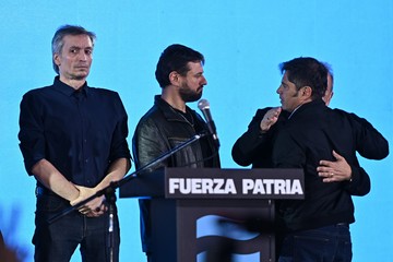 26.10.2025 Elecciones legislativas 2025: Bunker Fuerza Patria en Hotel Grand Brizo, La Plata, Buenos Aires. Máximo Kirchner, Juan Grabois y Axel Kicillof. Foto Pedro Lázaro Fernández