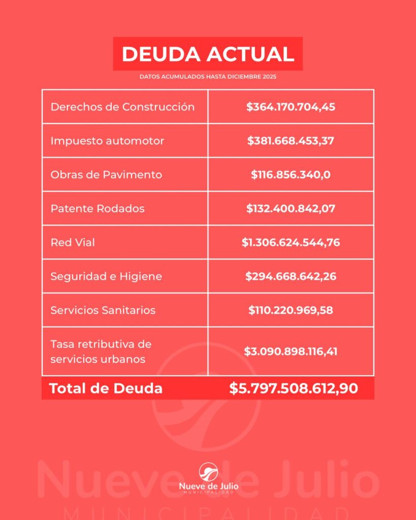 Si bien la gacetilla difundida por la Municipalidad no aclara a que ejercicio corresponde esa deuda, si solo hace mención hasta diciembre 2025, por lo que puede pensarse de años anteriores, también. Según destaca la nota de prensa, la deuda acumulada en concepto de tasas e impuestos municipales, de mas de 5.000 millones de pesos, es una cifra que impacta de manera directa en la capacidad del Estado local para sostener y ampliar obras públicas, renovar equipamiento y garantizar la prestación eficiente de los servicios básicos en todo el distrito.
