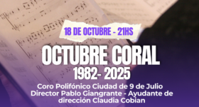 Este próximo sábado 18 de octubre, a las 21 hs., la Dirección General de Cultura y el Coro Polifónico 9 de Julio, invitan a la segunda fecha del ciclo Octubre Coral....