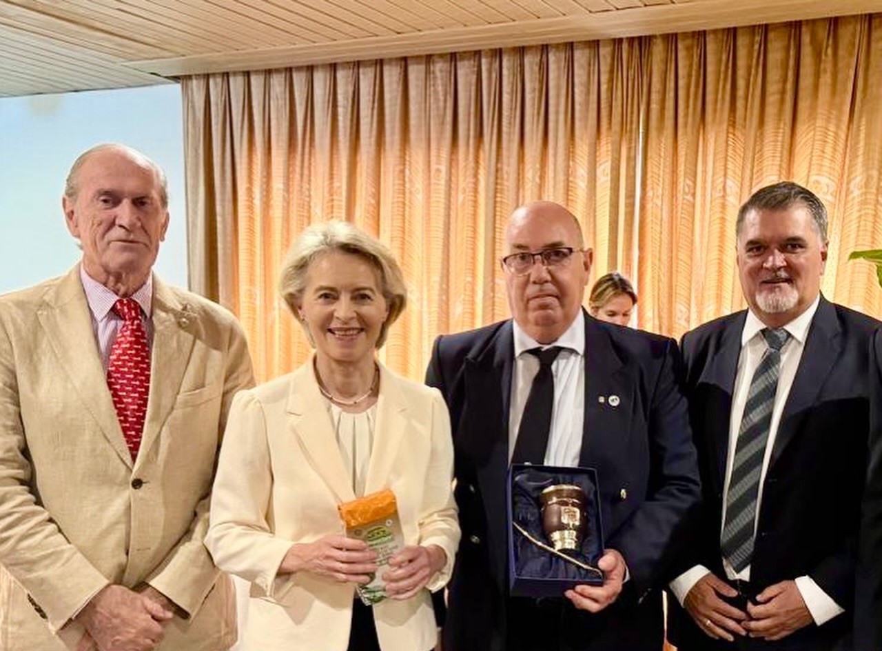 “Mandamos a hacer el mate y le dije a Dani -Daniel Prieto de Paraguay, vice 2do de la FARM, para que haga la logística. Nos hicieron pasar ahí al privado, llegamos hacia ella -Úrsula Von der Leyen. Cómo anécdota, nos hizo de nexo y traductor el presidente -Santiago- Peña, le explicó que era el mate, que era la bombilla, y a partir de ahí conversamos algo, sobre quiénes éramos y a quienes representamos y le dimos de la yerba también, que es orgánica. Y como otra anécdota le dijimos además que era libre de glifosato”.