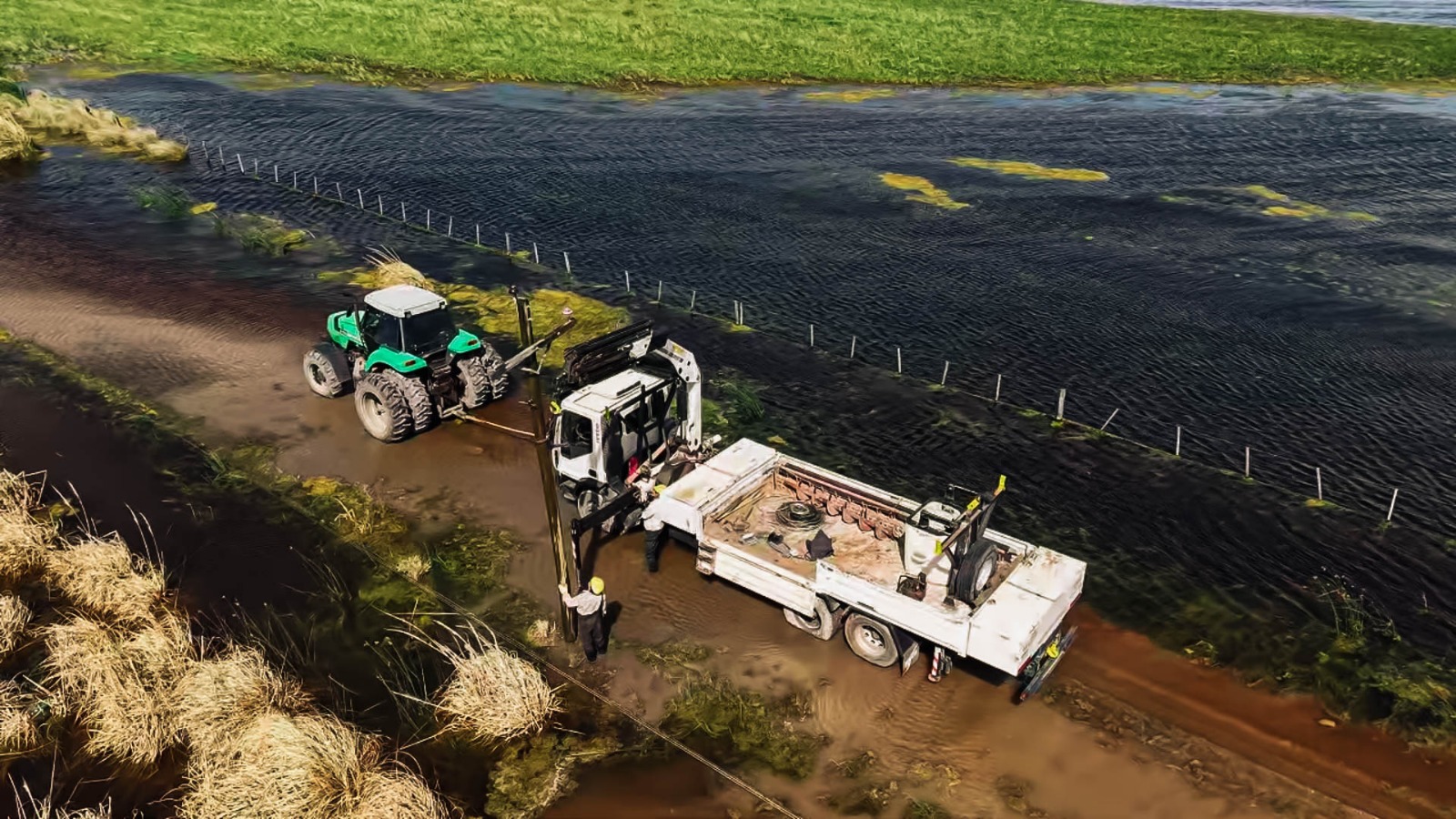 Durante la tormenta, la Guardia del Sector Eléctrico no se detuvo. En Carlos María Naón, los técnicos siguieron su trabajo en una de las zonas más afectadas por la tormenta y las inundaciones: caminos anegados, postes caídos y barro que complica cada paso.