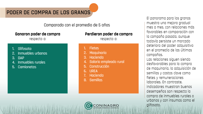 CONINAGRO presentó su informe mensual que analiza el poder de compra de seis productos clave de la producción agropecuaria en Argentina: soja, maíz, trigo, ternero, novillito y leche. Este indicador mide la capacidad de estos productos para adquirir una amplia gama de insumos, costos e inversiones del sector agropecuario, que incluyen herbicidas, fletes y maquinaria, y 20 variables más que se analizan.