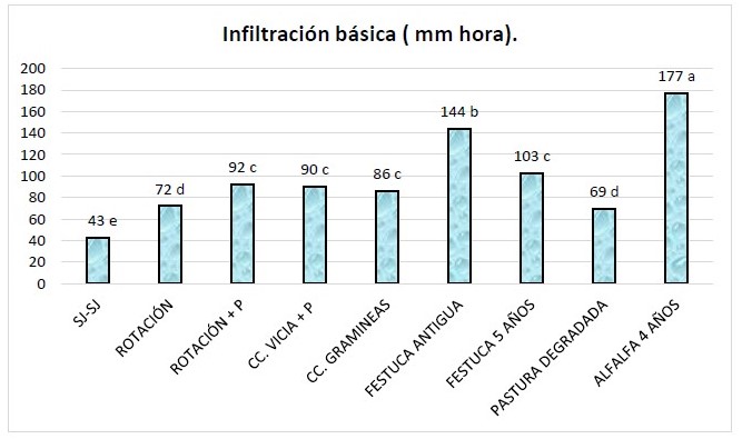 De la figura se puede apreciar que los mejores índices de infiltración los tuvieron las pasturas de alfalfa de alta producción y festuca antigua (+ de 20 años). Por otro lado, la infiltración en la secuencia agrícola en rotación y alto nivel de fertilización con fósforo; cultivos de cobertura de vicia o de gramíneas fue mayor respecto a pastura degradada.