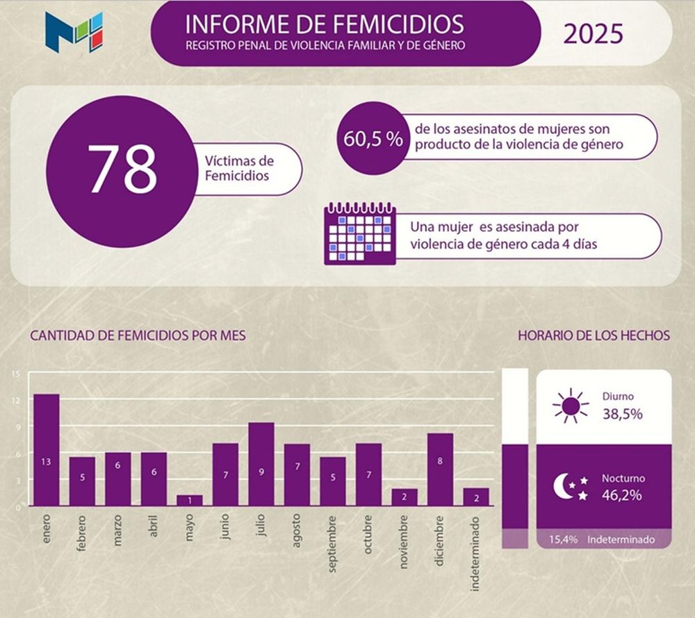 El relevamiento también identificó 74 procesos penales por femicidio que dejaron un saldo de 78 víctimas fatales. Esa cifra representa el 60,5% del total de homicidios de mujeres registrados en la provincia durante el mismo período, lo que confirma que la violencia de género continúa siendo el principal motivo detrás de las muertes violentas de mujeres.