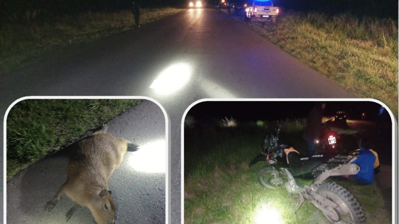 Conforme informo Policia de Carlos Casares, el  día 30/09/25 siendo las 23:00 Hs., aproximadamente, por causas que se tratan de establecer, en Ruta Provincial nro. 50 de este medio, distante a unos 5 km del acceso a la localidad de Mauricio Hirsch, en dirección  hacia la localidad de Moctezuma, se produce un accidente de tránsito, entre una  motocicleta marca Honda modelo XR 125L de color negra  la cual era conducida por el ciudadano Molina Joaquín Nicolás (20), siendo acompañado por una menor del sexo femenino, quienes colisionan contra un animal denominado carpincho, lo cual produce la caída de los antes nombrados hacia la cinta asfáltica.